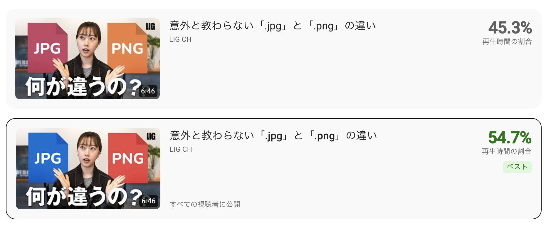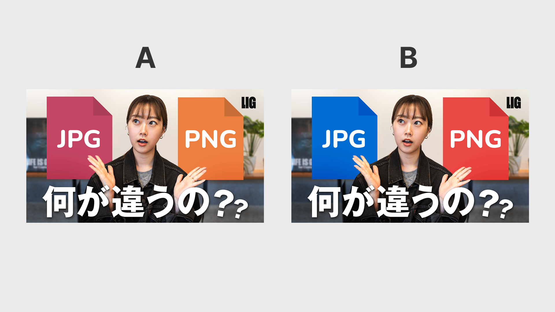 色の違いだけでこんなにも差が出るのはびっくりですよね。こういった比較系のサムネイルは、コントラストをハッキリさせることが大切だと感じました。