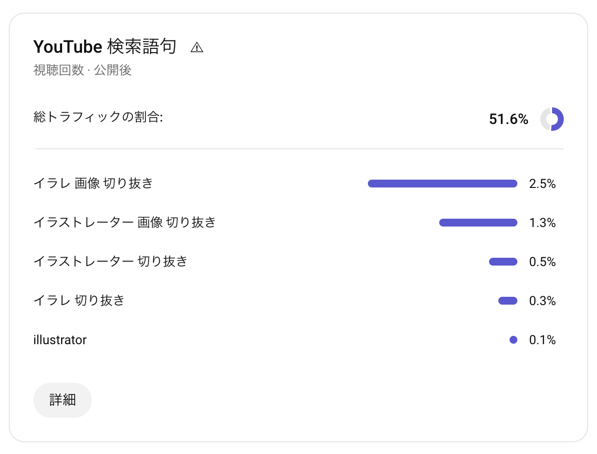 例えば、リニューアル以前の約3年前に公開した【Illustrator】画像の切り抜き方法 ×3 という動画は未だに伸び続けており、YouTube検索からの流入が51.6%と約半分を占めています。新規視聴者を獲得する動画の1つになっています。