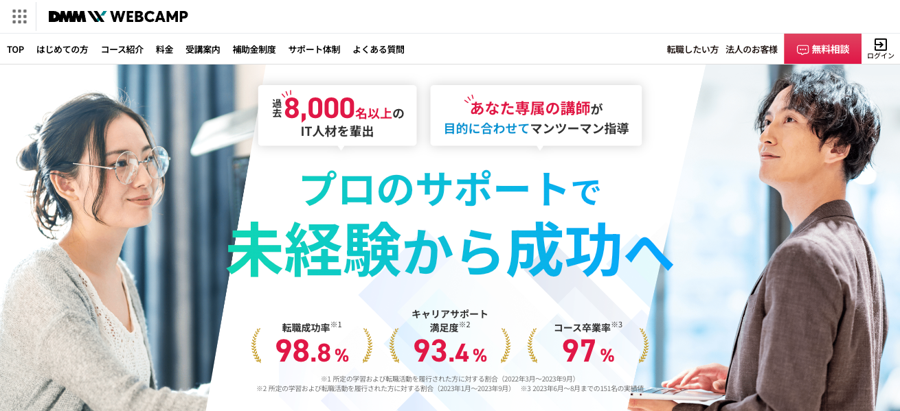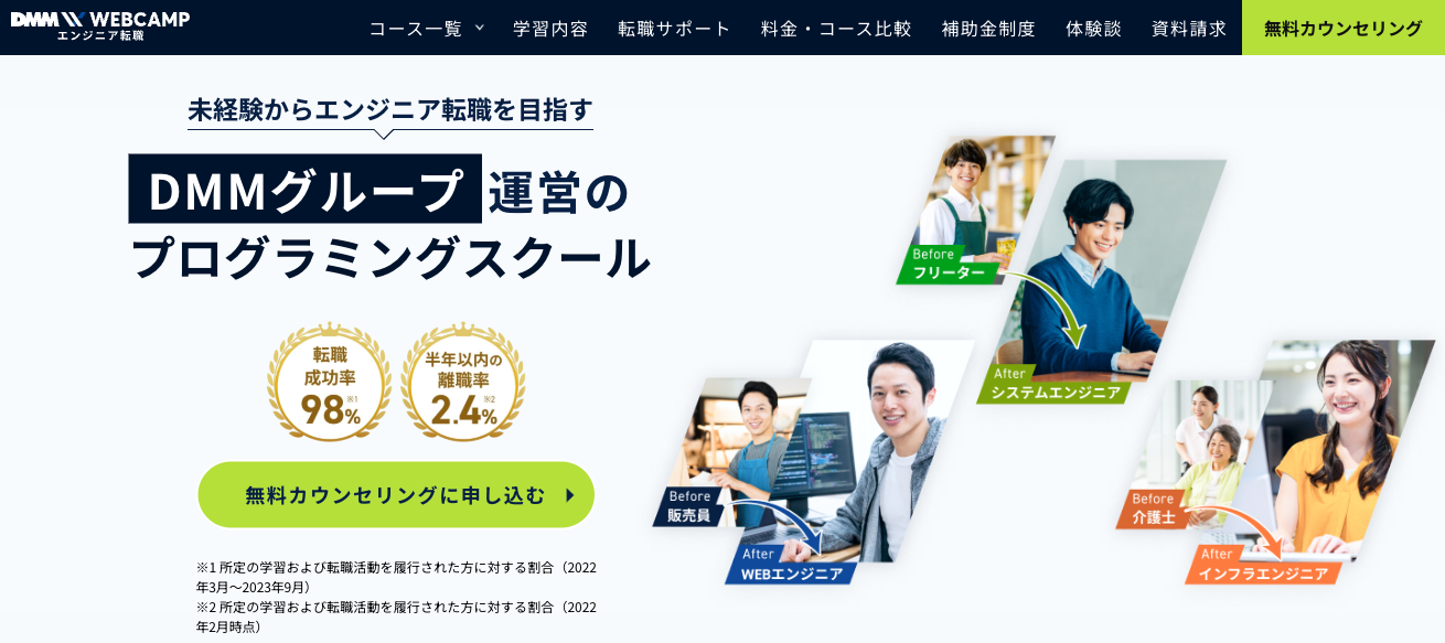 DMM WEBCAMPは、未経験からのエンジニア転職やWebデザインスキルを学べる、人気のスクールです。
