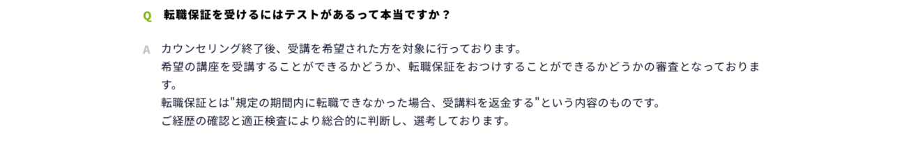 学習を始める前の面談で転職ができる見込みがあるかどうかで、この保証を受けられる方と受けられない方を選別しているみたいです。