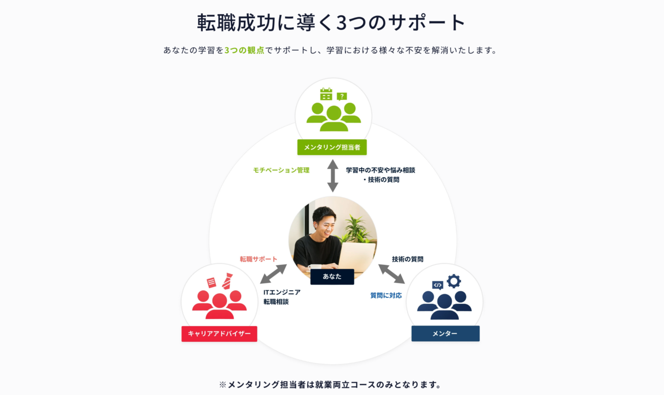 - 注意点❌:カリキュラムの難易度は高めで自走力が求められる。手厚い「転職保証」には年齢制限やその他条件も。