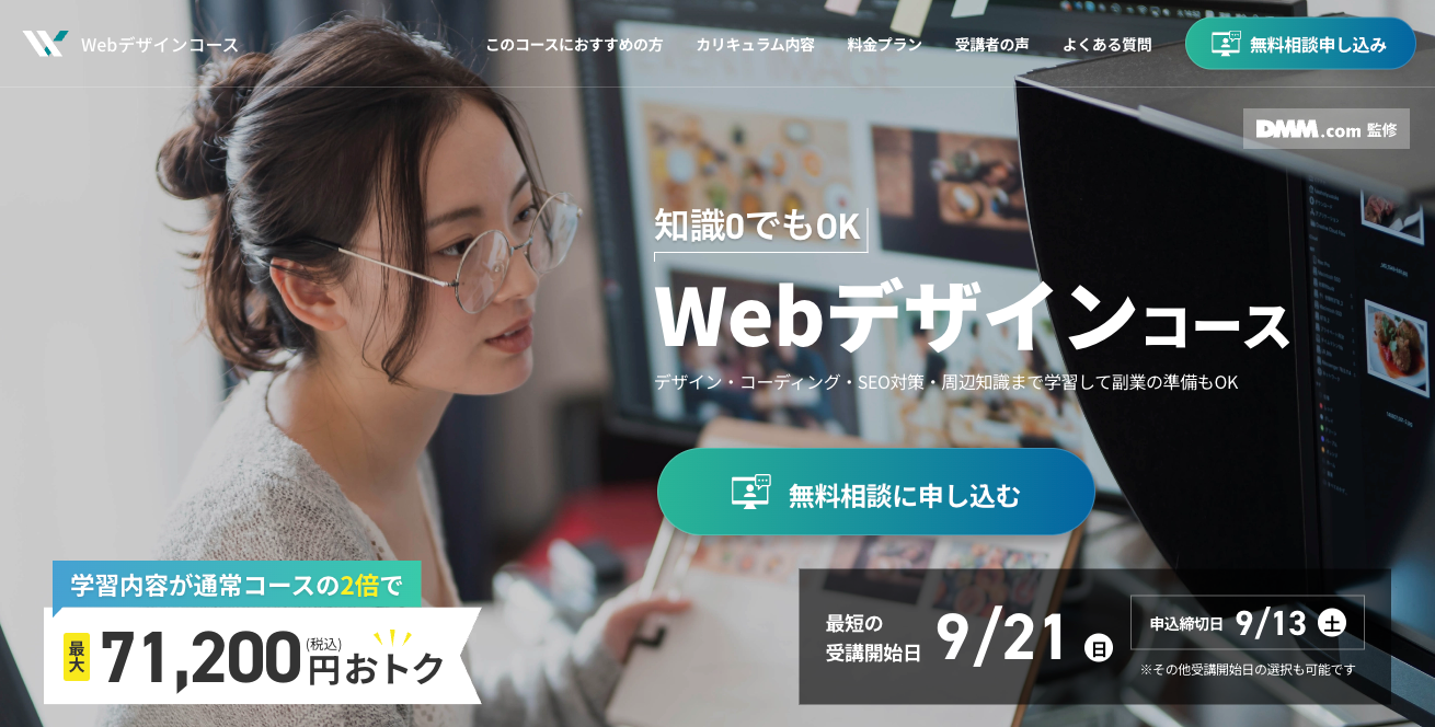 Webサイトのデザインからコーディング、さらにはSEO対策まで、実務に必要なスキルを網羅的に学べる人気のコースです。