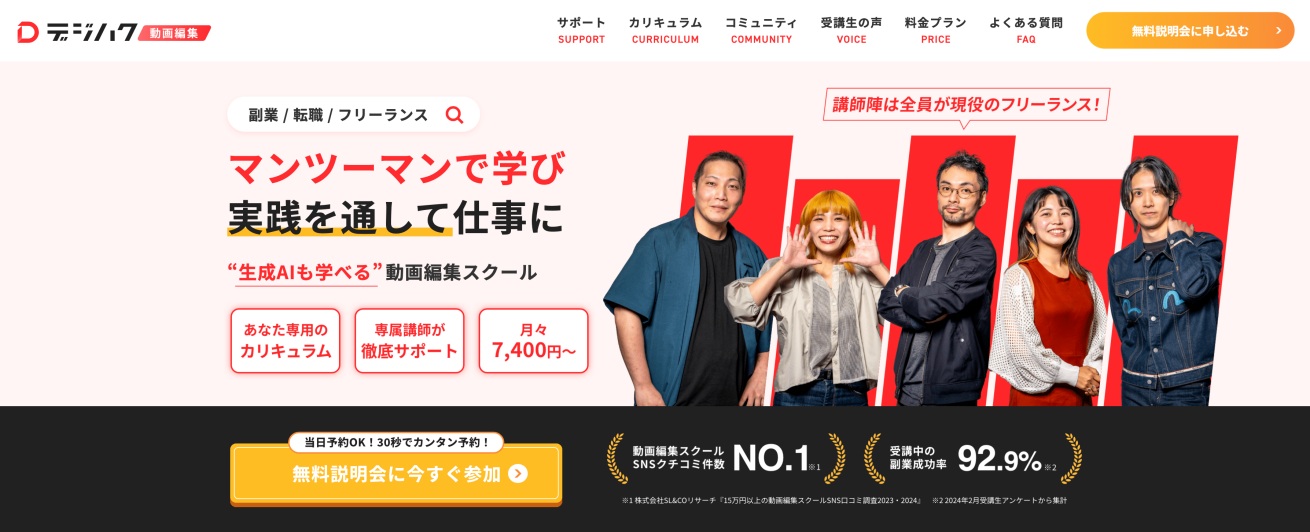 デジハクは、未経験から動画編集スキルを習得し、副業やフリーランスとしての活動を目指す方向けのオンライン動画編集スクールです。