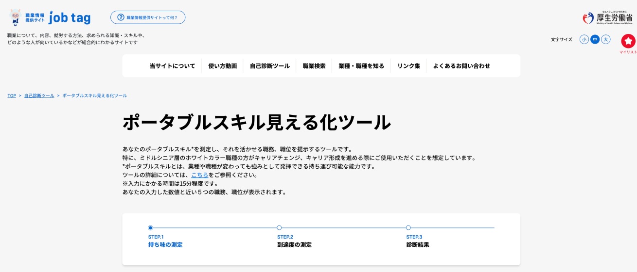 客観的に自分のポータブルスキルを測定したい場合は、厚生労働省が提供する「ポータブルスキル見える化ツール」が便利です。