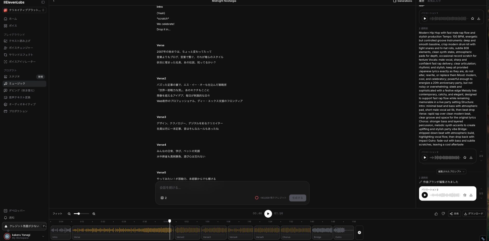 ElevenLabsでプロンプトを入力して、生成されたメロディから、良さそうなものをベースに採用していきます。