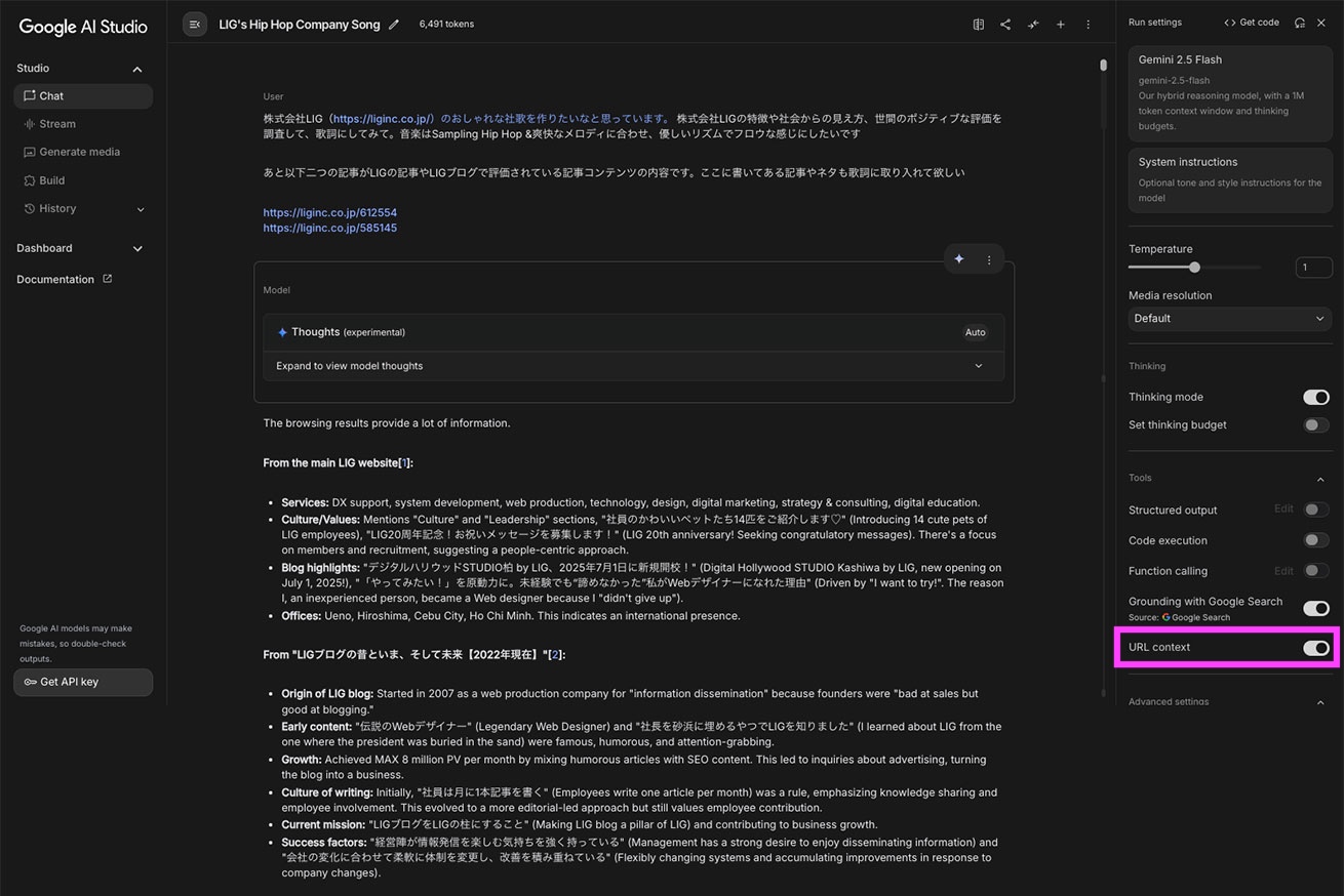 URL contextのトグルをONにしたうえで以下の記事を読み込ませ、LIGのカルチャーやブログの雰囲気をインプットしました。