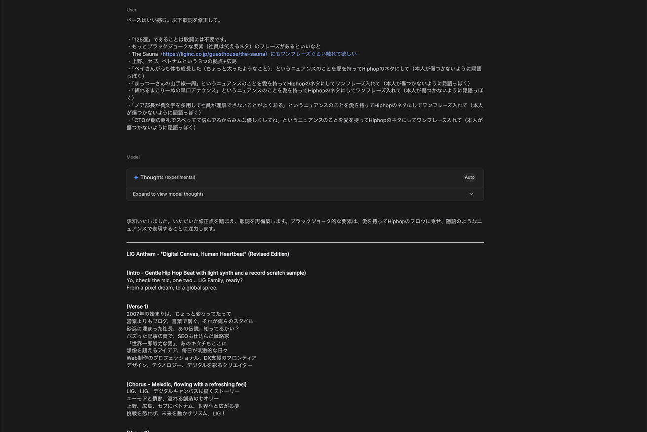 LIGの歴史やカルチャーを盛り込みつつ、お祝いムードを演出し、しかもAIが「秒で」作ってくれる、テクノロジーの面白さとLIGらしさが詰まった一曲になりました。