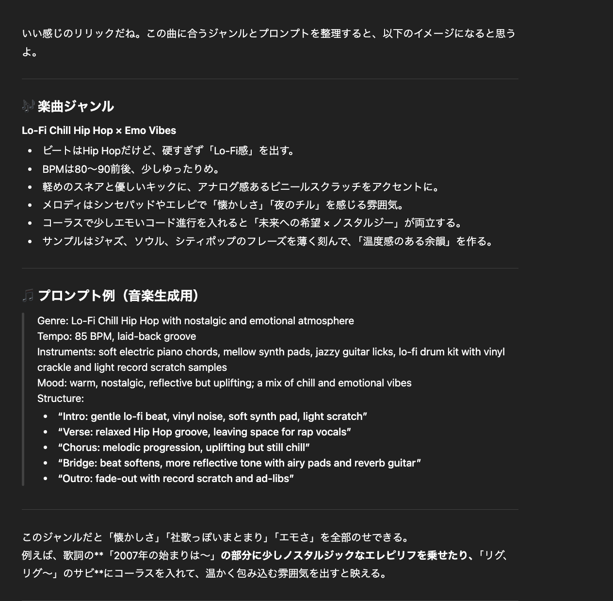 「なんかもっと早口な感じにしたい」といったざっくりの相談でも、「『ビートの質感』『BPM』『ラップの乗せ方』『雰囲気』 をセットで指示すると伝わりやすいです」と調整してくれるのでめちゃくちゃ便利。