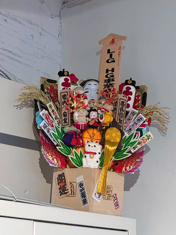 事業部の業績が上がるごとに「昨年より少し高い熊手を買う」という暗黙のルールが存在します。100円、1000円、マネージャーは5000円など、みんなで少しずつ縁起担ぎに参加するのが恒例。