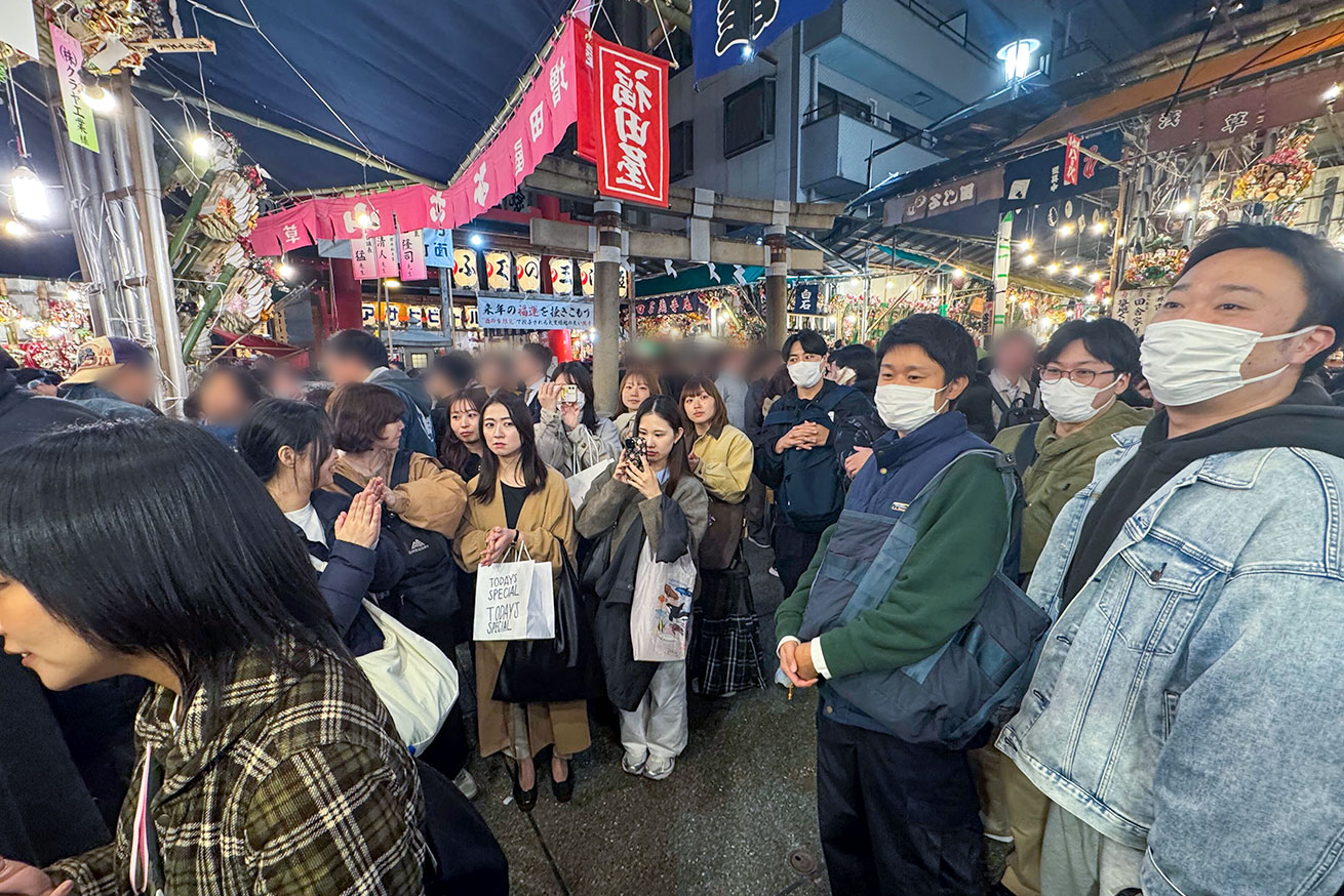 今年は総勢15人の大所帯での参拝。熊手をじっと見つめるメンバーの姿も、どこか真剣です。