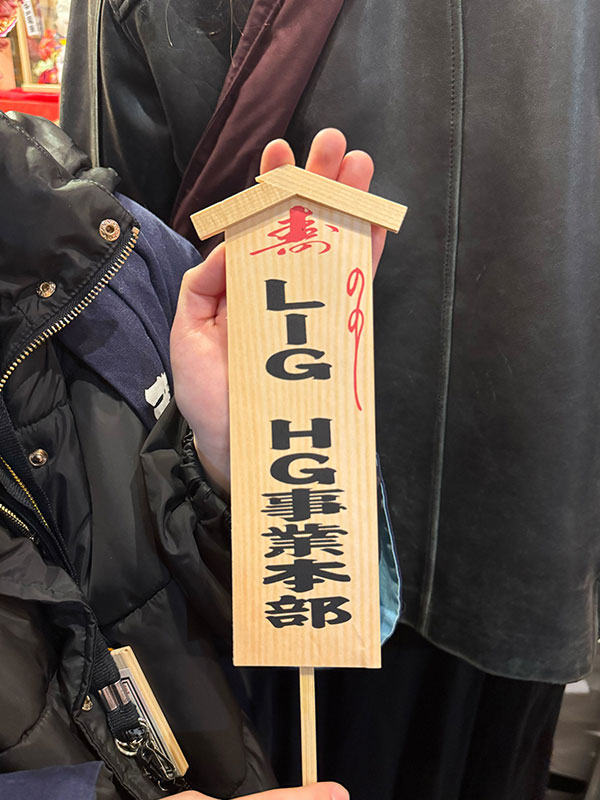 購入した熊手には、木札に「LIG HG(Human Growth)事業本部」と書いてもらいました。