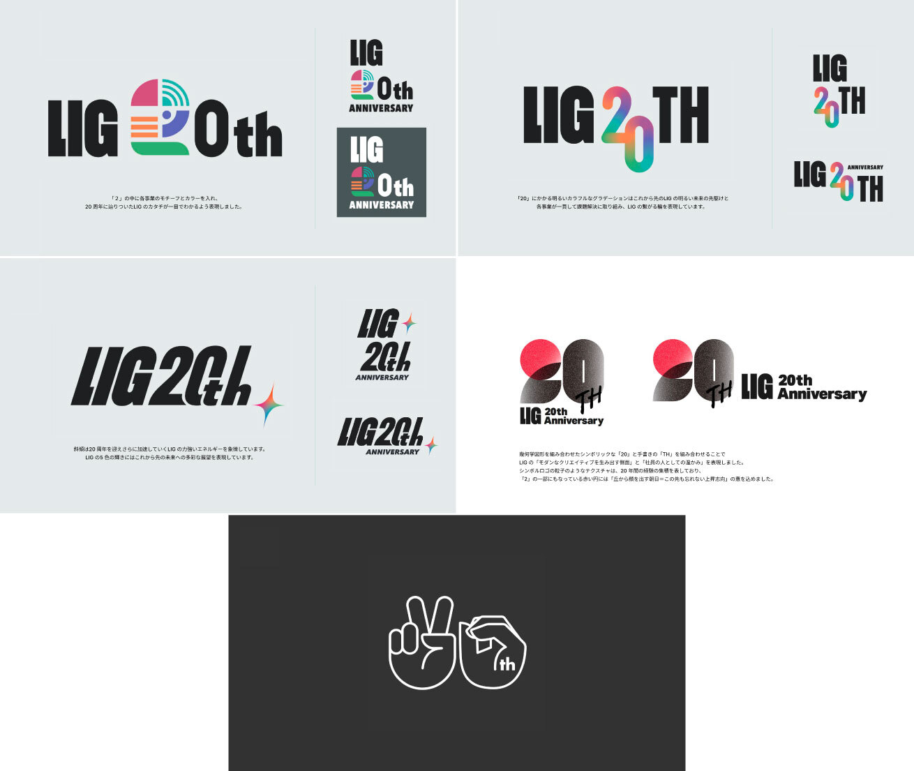グリッドに沿ったデザインにしたことで、横組や上下など、いろんなパターンのロゴが生まれました。どのパターンを使っても、LIGらしさを保ちつつ20周年をしっかり表現できる、使い勝手の良いロゴになりました。