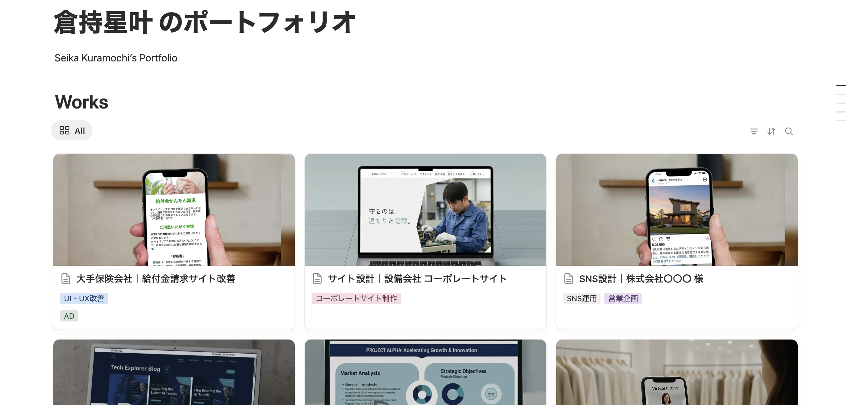 Notionで作られたそのポートフォリオは、シンプルながらも圧倒的な情報量で、書類選考をほぼ通過してきたそうです。