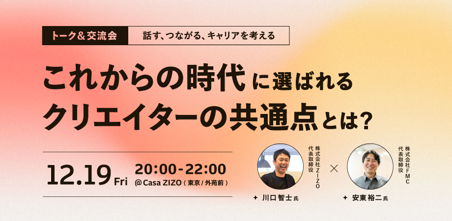 株式会社ZIZO代表 川口さんと株式会社FMC代表 安東さんをお迎えし、「これからの時代に選ばれるクリエイターの共通点」をテーマに語り合います。