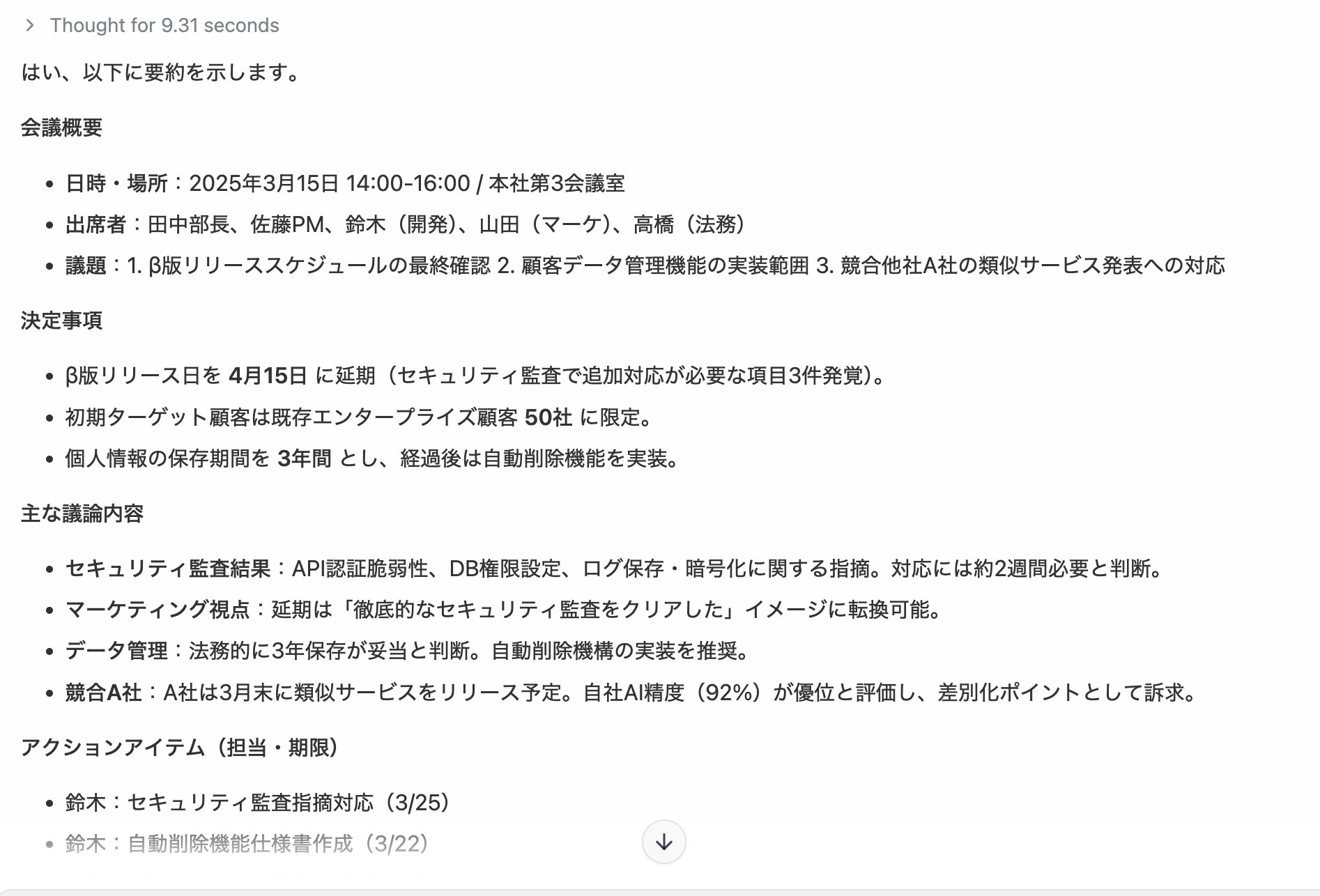 レベルを上げると回答の精度が向上する可能性がありますが、そのぶん処理時間が長くなります。複雑な問題解決や論理的な分析が必要な場面では高めに、簡単な質問には低めに設定すると効率的です。