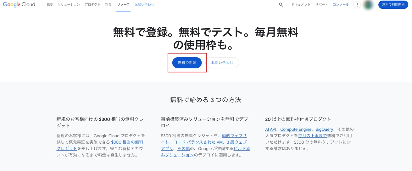 まずはBigQueryを利用したいGoogleアカウントでログインして以下のURLにアクセスし、「無料で開始」をクリックしましょう。