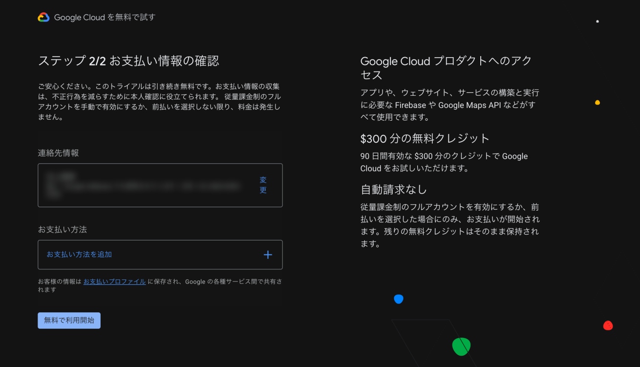 利用するためにはクレジットカードなど支払い方法の登録が必要です。ちなみに初回登録時はトライアルとして90日間使える300$分のクレジットがもらえます。