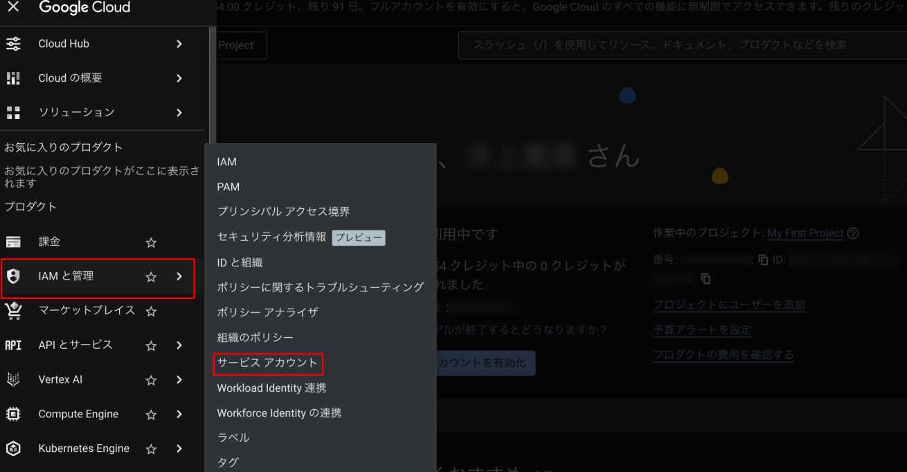 登録完了後、コンソール(管理画面)が開きます。BigQueryを利用するためにはサービスアカウントが必要ですので、作成していきましょう。