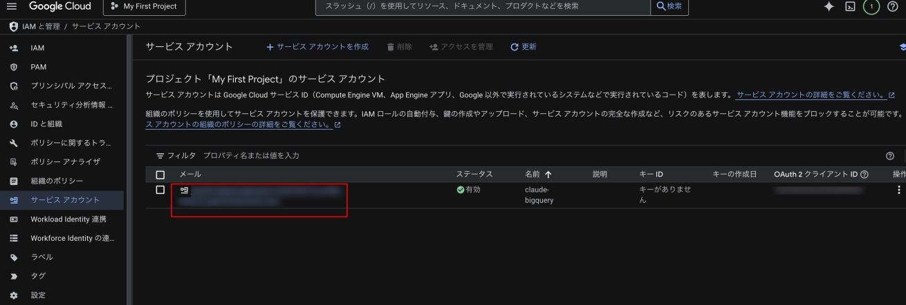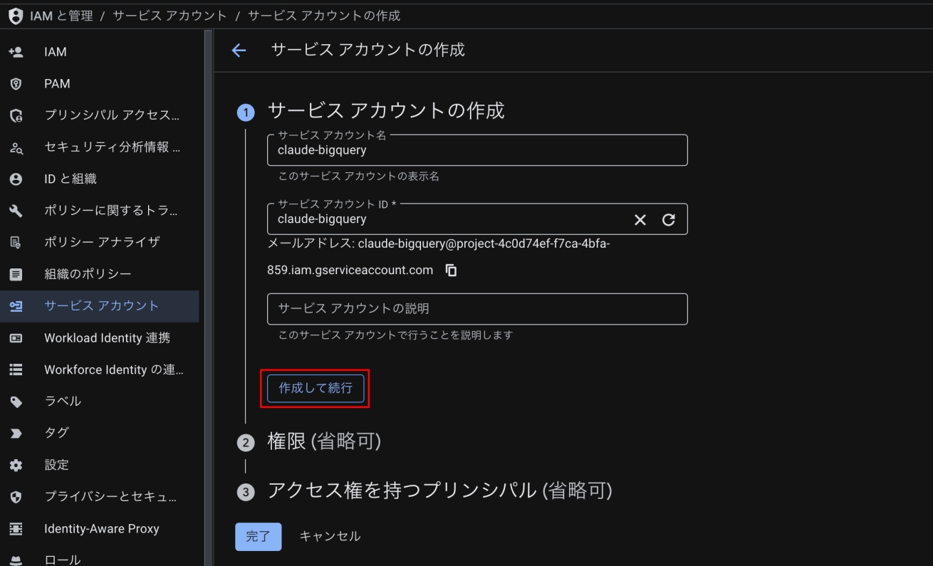- サービスアカウント名:わかりやすい名前を入力(例:claude-bigquery)
