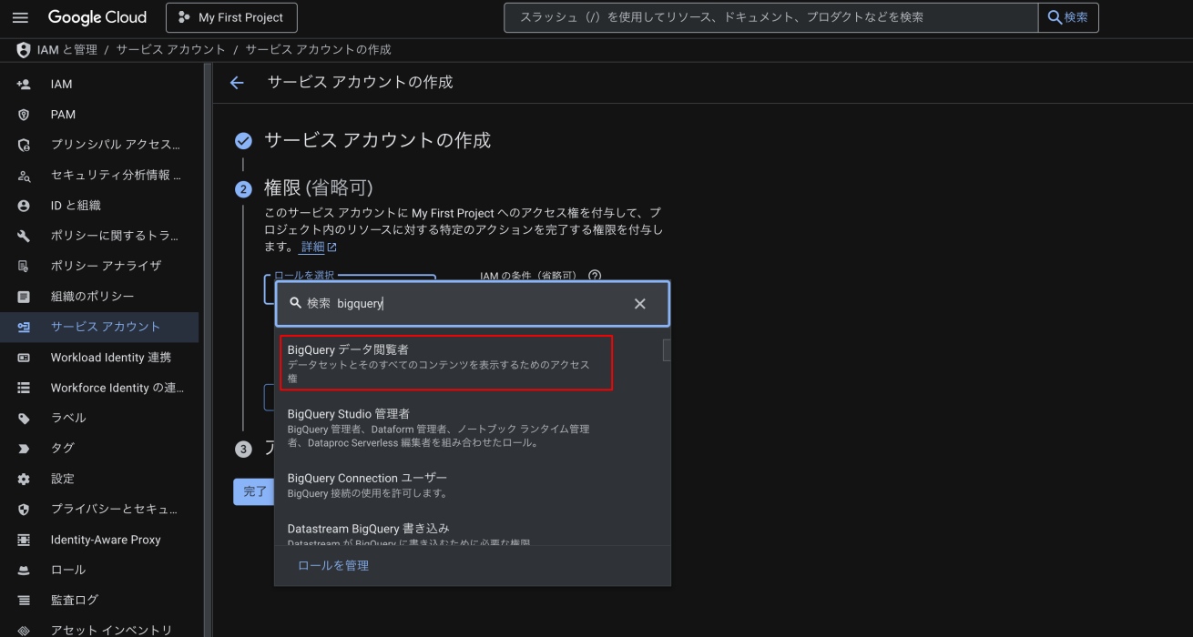 💡初めてBigQueryを使う方は、データ上書きなどの事故を防ぐために「BigQuery データ閲覧者」を選びましょう。使い慣れてきたら必要に応じて他の権限を付与してください。
