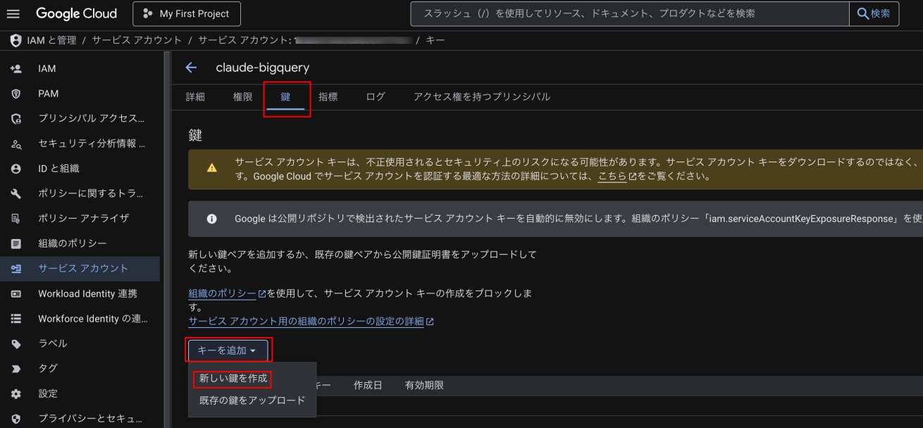 続いて、AIがBigQueryのデータにアクセスする許可証となる、鍵(JSONファイル)をダウンロードします。