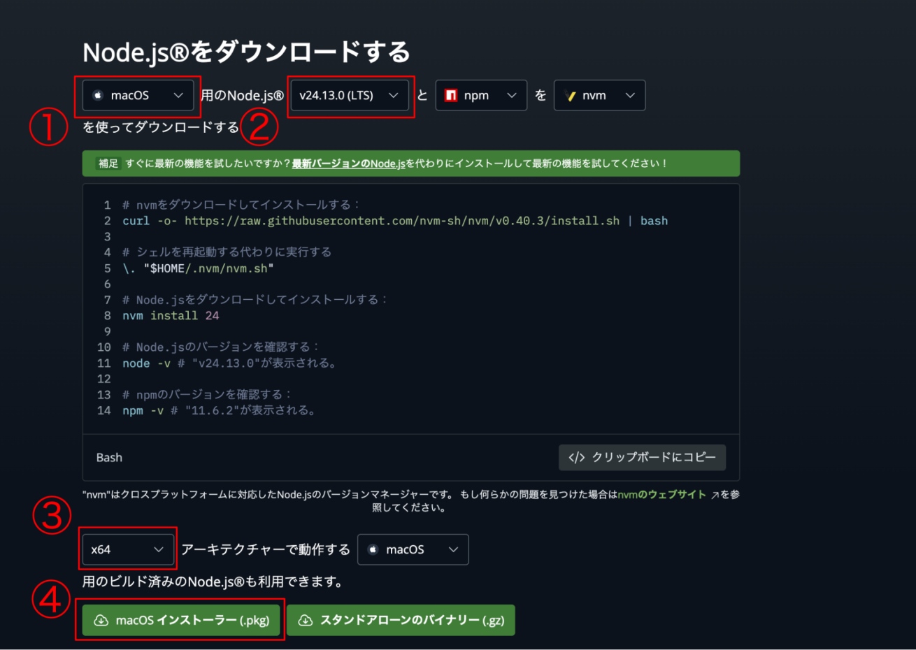 - Node.jsがインストールされているか確認(手順を見る)→エラーが出たら再インストール