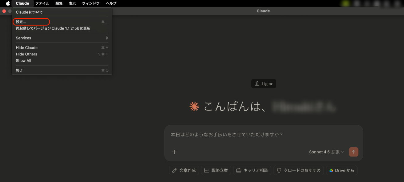まずは上部メニューバーのClaude→設定(Windowsはファイル→設定)をクリックしましょう。