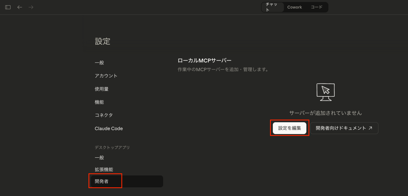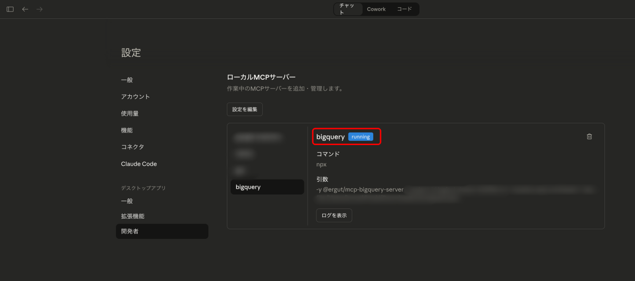 BigQueryとClaudeが接続できているか確認していきます。さきほどと同様、メニューバーの「設定」→「開発者」を開いてください。