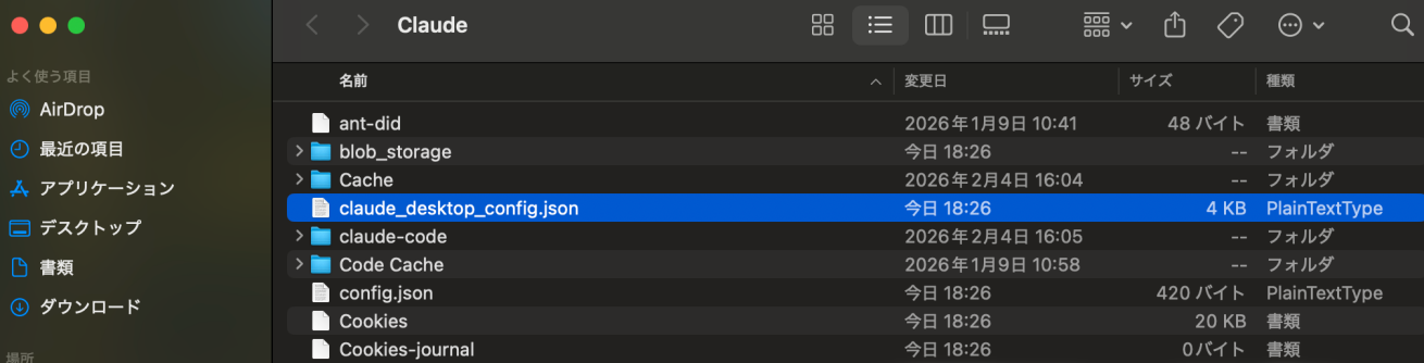 フォルダが表示されるので、claude_desktop_config.jsonというファイルをテキストエディターで開き、以下のコードをコピペして貼り付けてください。