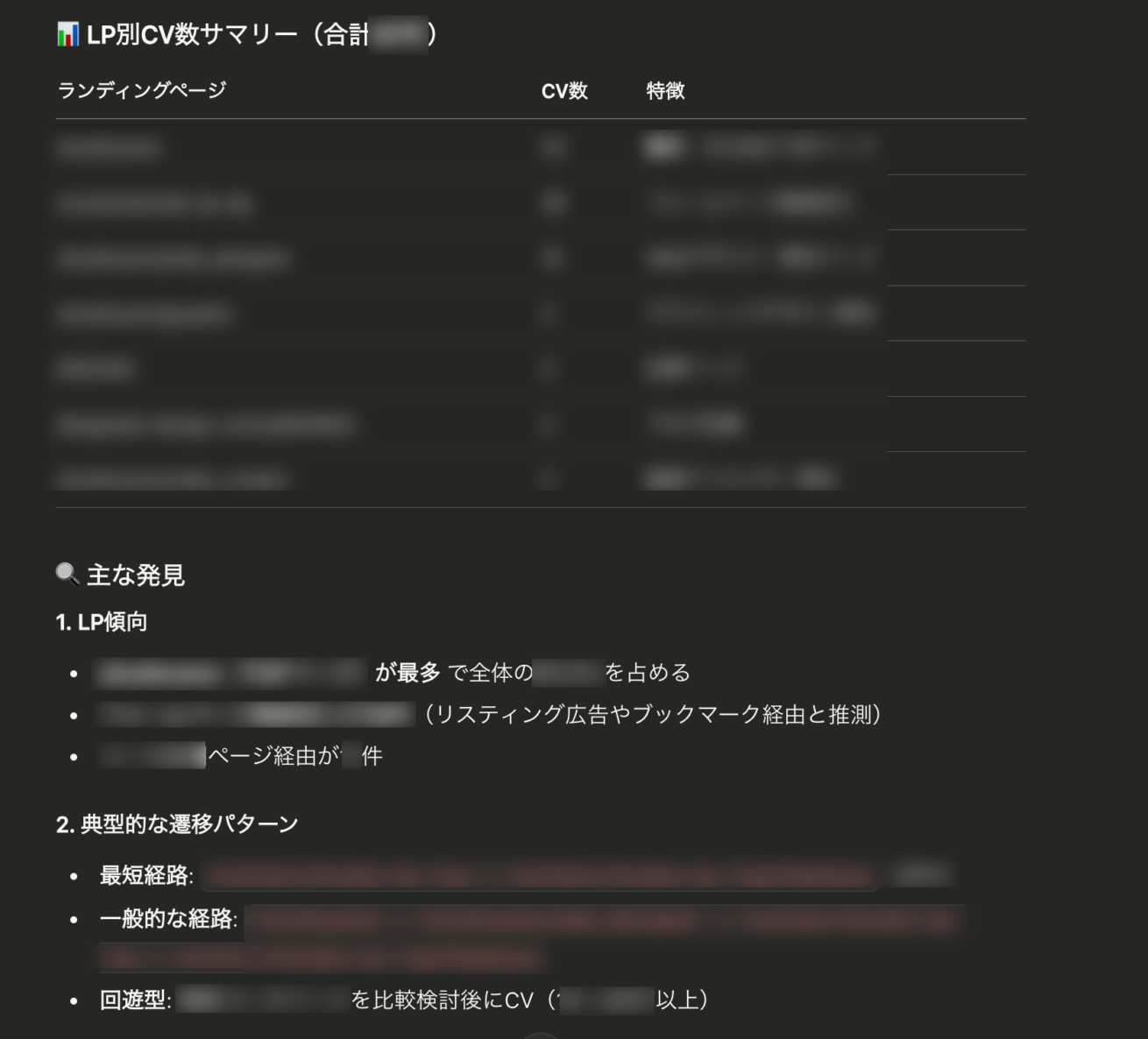 特におすすめなのが、BigQuery MCPとClaudeの連携です。たとえば「直近1週間で◯◯事業に問い合わせをしたユーザーのLPと、問い合わせ完了までの行動経路を分析してほしい」と指示すると、こんな感じでまとめて出してくれるようになります。