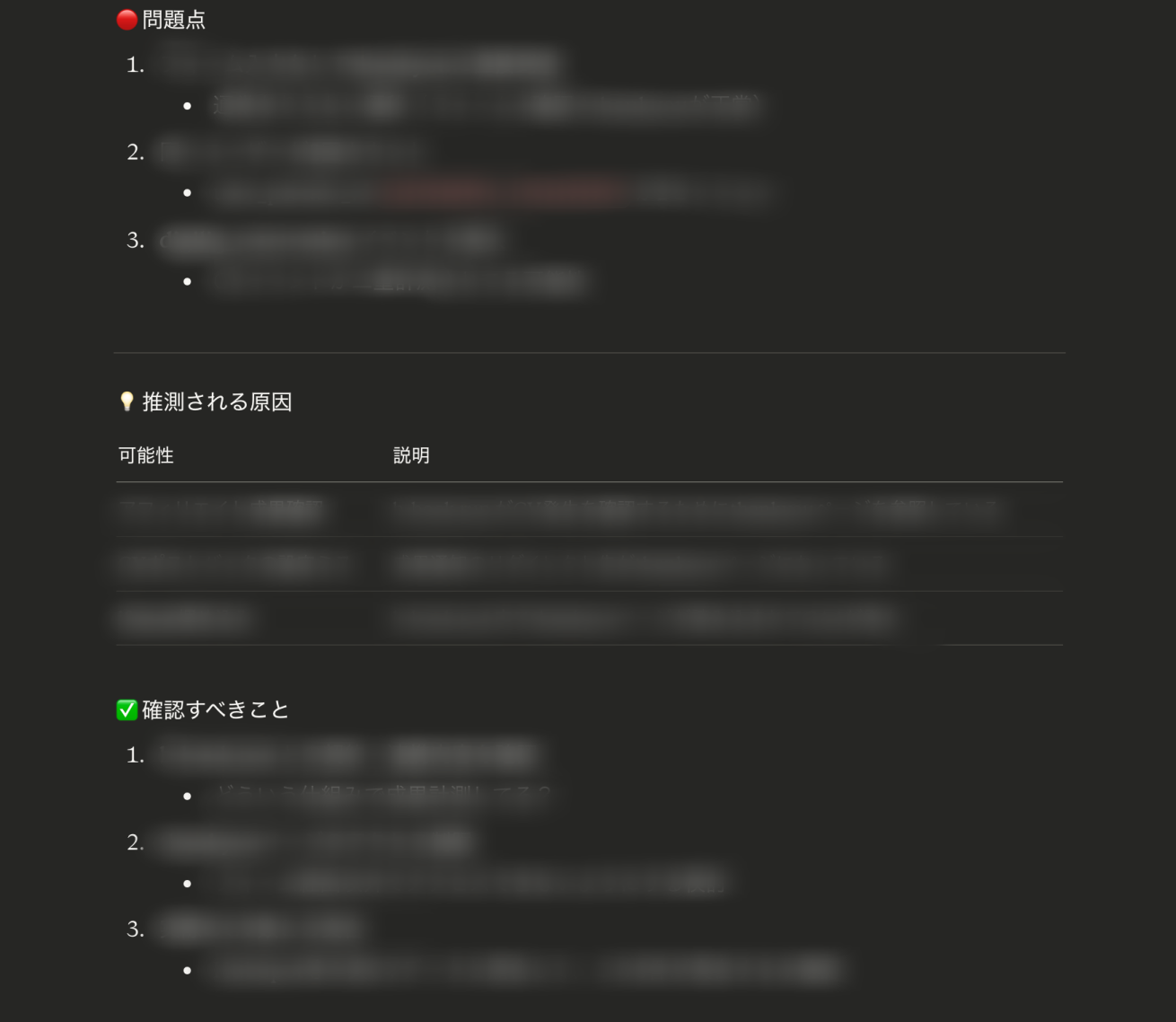 問題点や確認事項、改善案まで一気に提案してくれます!(リアルな内容なので中身を見せられずすみません……)
