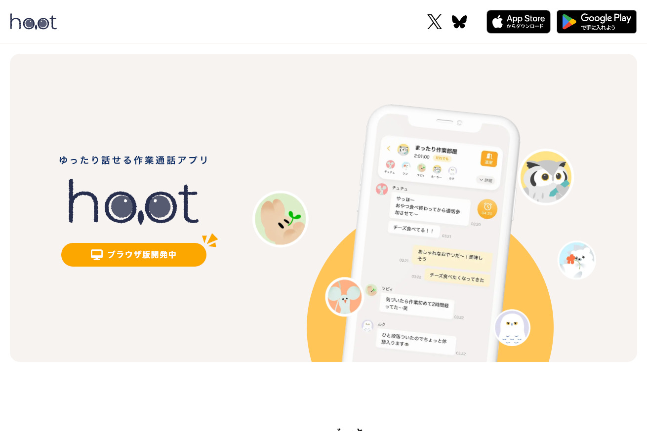 作業通話アプリ「hoot(ふーと)」。「おうちをひらく」というコンセプトで友達と繋がり、ポモドーロタイマーで一緒に集中したり、画像やURLを共有しながら作業できるアプリになってます。