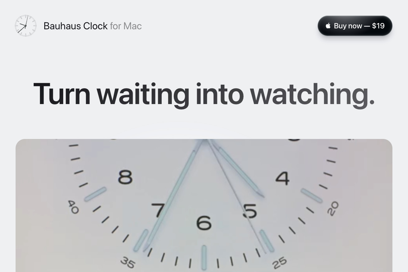 Mac用の時計スクリーンセーバー「Bauhaus Clock」($19買い切り)です。3種類の時計の動きから選べて、16色の文字盤とOLED焼き付き防止機能を搭載してます。