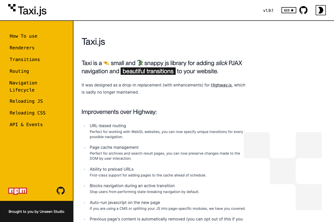 メンテナンスが終了したHighway.jsの代替として開発され、URLベースのルーティング、ページキャッシュ管理、プリロード機能などの改善が加えられています。