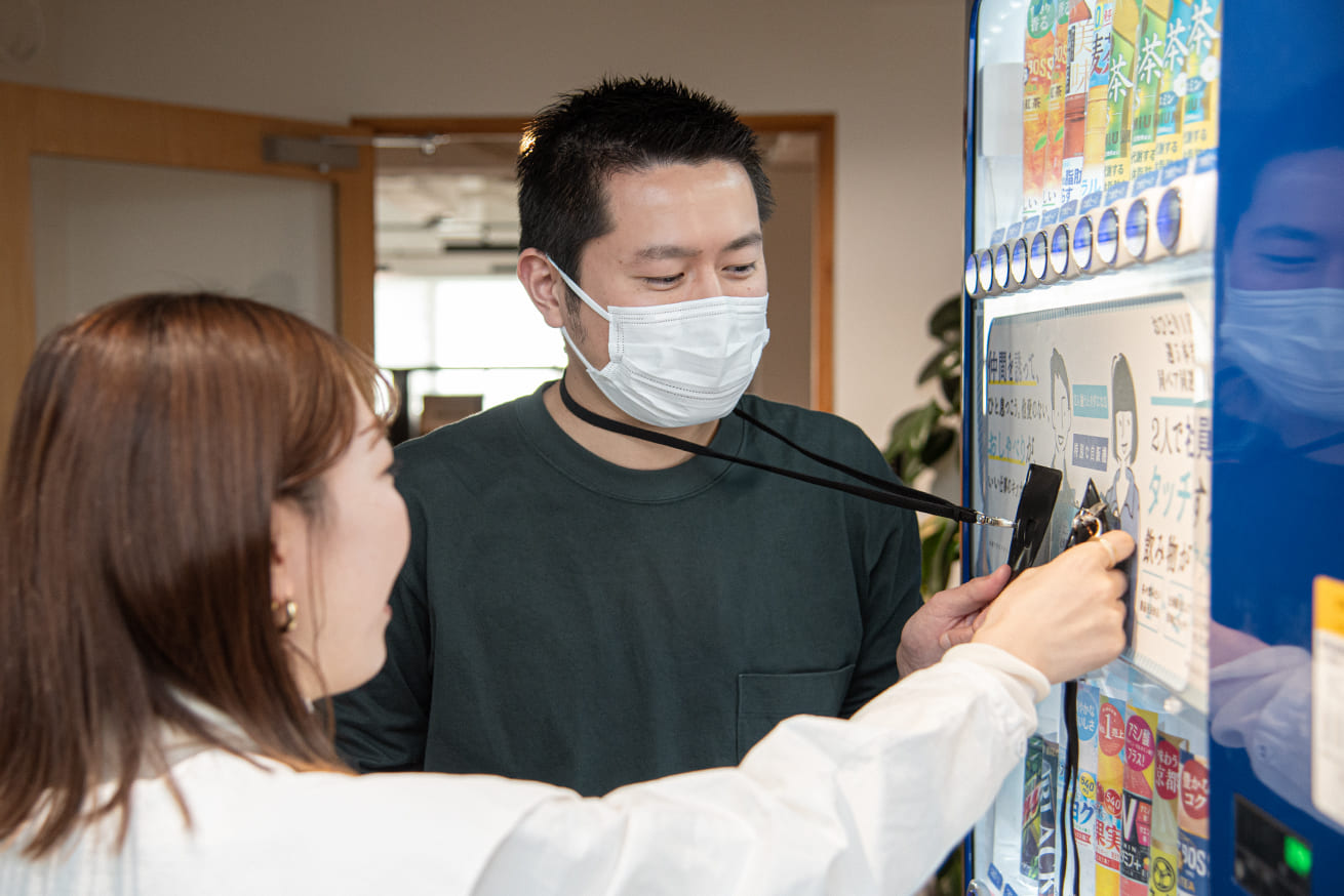 ▲おごり自販機。2人で社員証を同時にタッチすると、1日1人1本ずつ無料で飲料がもらえる仕組み