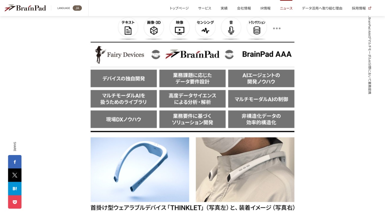 株式会社ブレインパッドは、データサイエンティスト数が国内随一で、質の高さもトップクラスを誇る企業です。2025年3月には、Fairy Devices、BrainPad AAAとマルチモーダルAI分野において業務提携を発表しました。