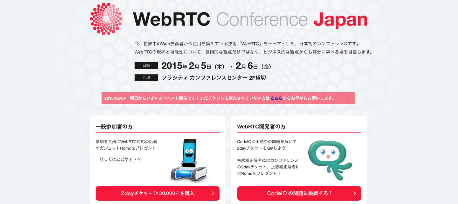 このイベント「WebRTC Conference」は、WebRTCをテーマとした日本初のカンファレンスです。WebRTCの現状と可能性について、技術的な観点だけではなく、ビジネス的な観点からも存分に学べる場を目指します。引用元:WebRTC Conference Japan
